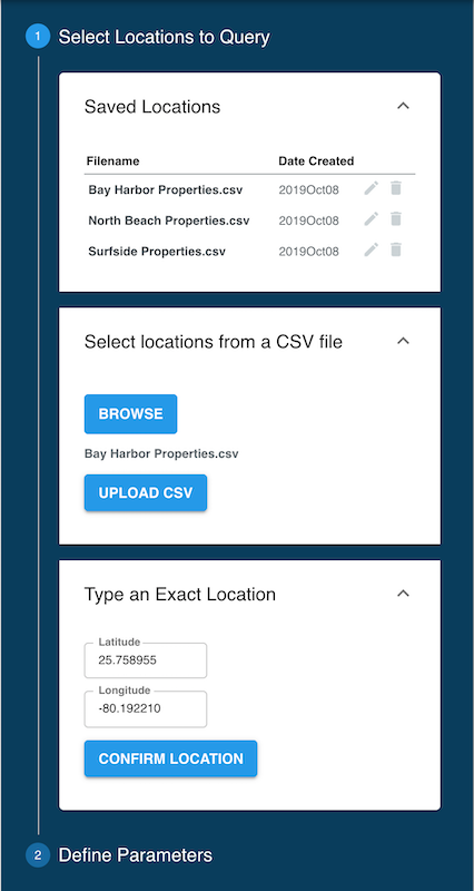 Using Saved LocationsWhen either individual coordinates or a CSV file is uploaded, the data is saved in the Saved Locations card in the Query panel. This function enables users to re-run any data that was already uploaded. Selecting one of the saved locations brings the respective file up to select hazard parameters. Saved Locations can be edited by clicking on the Pencil icon to the right, or deleted by clicking on the Trash Can icon. Uploaded CSV files are persistent across user sessions, they stay available in the Saved Locations section until they are manually deleted. |