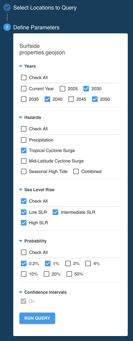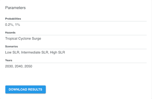 YearsThe point of time (year) in the future to run the analysis for. HazardsPrecipitationFlooding caused by heavy rainfall. Tropical Cyclone SurgeFlooding caused tropical wind system such as hurricanes or typhoons. Mid-Latitude Cyclone SurgeFlooding caused by storms that do not originate in the tropics (e.g. nor’easters) and other events that push water from the ocean onto the land. Seasonal High TideFlooding caused by high tides that can lead to nuisance flooding. Colloquially these are sometimes called flooding from “King Tides” or “Sunny Day” flooding. CombinedStatistical combination of the probabilities of each hazard in the flood peril. Sea Level RiseSelect the sea level rise scenario of interest. The Low scenario assumes a rise of the Global Mean Sea Level (GMSL) of 0.3 meter by the year 2100, Intermediate assumes 1 meter GMSL rise and High a 2 or more meters GMSL rise by 2100. Find more information about the GMSL scenarios in the Sea Level Rise section. ProbabilityThe annual probability of a flood event. Learn more in the Event Probability section. At least one item must be checked in each category. |
