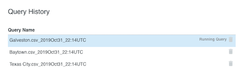 Run QueryWhen done with parameters click on the Run Query button. Queries against a large number of coordinates and/or many parameters set may takes some time. Smaller jobs may complete in less than a minute while a query of 10,000 points and all parameters enabled can take up to 45 minutes. A job status appears in the Query History card. The following statuses will occur during the query analysis: