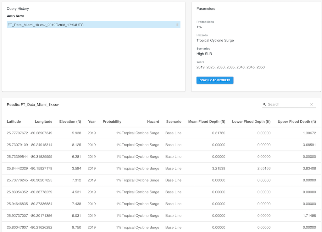After the analysis of a given set of coordinates is complete, the results are displayed in the Results panel in the bottom half of the screen. If there are multiple queries available in the Query History panel, the Results panel shows the results of the selected query in the Query History panel. The Results panel shows the first 180 rows of data generated. For individual coordinates or a small series of locations this may be the complete set of results. Larger CSV series will need to get downloaded to get the full results. Click on the Download Results button to save a copy of the CSV file including the respective analysis data to the browser's default download folder. The generated output file name is based on internal job encoding data, for instance 4b118ba8-7a5d-4bc9-8966-285e44b5796b.csv. It can be renamed to a more meaningful file name. For detailed information about the output file format, refer to the CSV formats section.