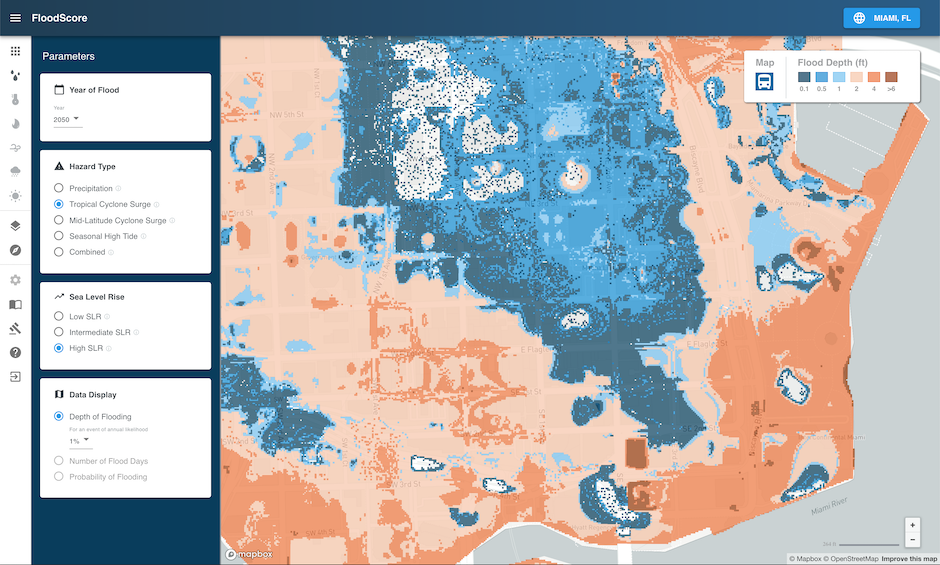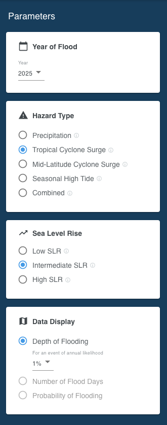 Year of FloodThe point of time (year) in the future to run the analysis for. The dropdown list contains the available years specific to the selected area (geography). Hazard TypePrecipitationFlooding caused by heavy rainfall. Tropical Cyclone SurgeFlooding caused tropical wind system such as hurricanes or typhoons. Mid-Latitude Cyclone SurgeFlooding caused by storms that do not originate in the tropics (e.g. nor’easters) and other events that push water from the ocean onto the land. Coastal FloodingFlooding caused by storms that originate in the Hawaiian islands. Seasonal High TideFlooding caused by high tides that can lead to nuisance flooding. Colloquially these are sometimes called flooding from “King Tides” or “Sunny Day” flooding. CombinedStatistical combination of the probabilities of each hazard in the flood peril. Sea Level RiseSelect the sea level rise scenario of interest. The Low scenario assumes a rise of the Global Mean Sea Level (GMSL) of 0.3 meter by the year 2100, Intermediate assumes 1 meter GMSL rise and High a 2 or more meters GMSL rise by 2100. Find more information about the GMSL scenarios in the Sea Level Rise section. Data DisplayThe Depth of Flooding setting allows to adjust the annual probability of a flood event. 50% means that the flooding shown on the map has a 50% chance of happening at least once in the selected year. By adjusting the event probability, the map displays the flooding projection for the respective event likelihood. Learn more in the Event Probability section. Number of Flood Days is available in conjunction with Seasonal High Tide only. By adjusting the depth threshold, the map shows the number of days on which the set threshold will be exceeded.